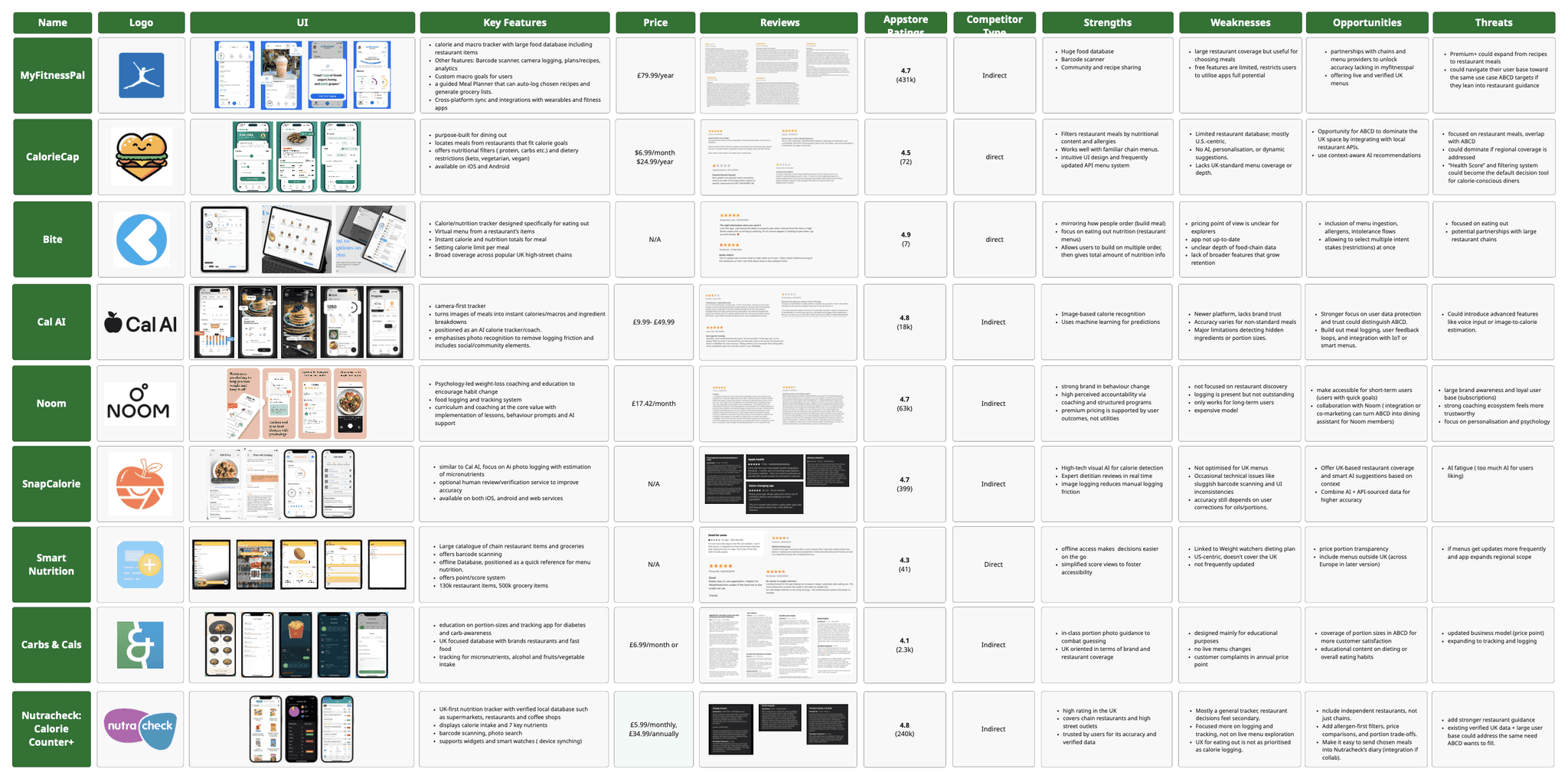 A competitor analysis was conducted to explore how existing nutrition and fitness apps are structured and positioned in the market. The purpose of this work was to understand user expectations and identify how ABCD could align with industry standards while still offering a unique value.