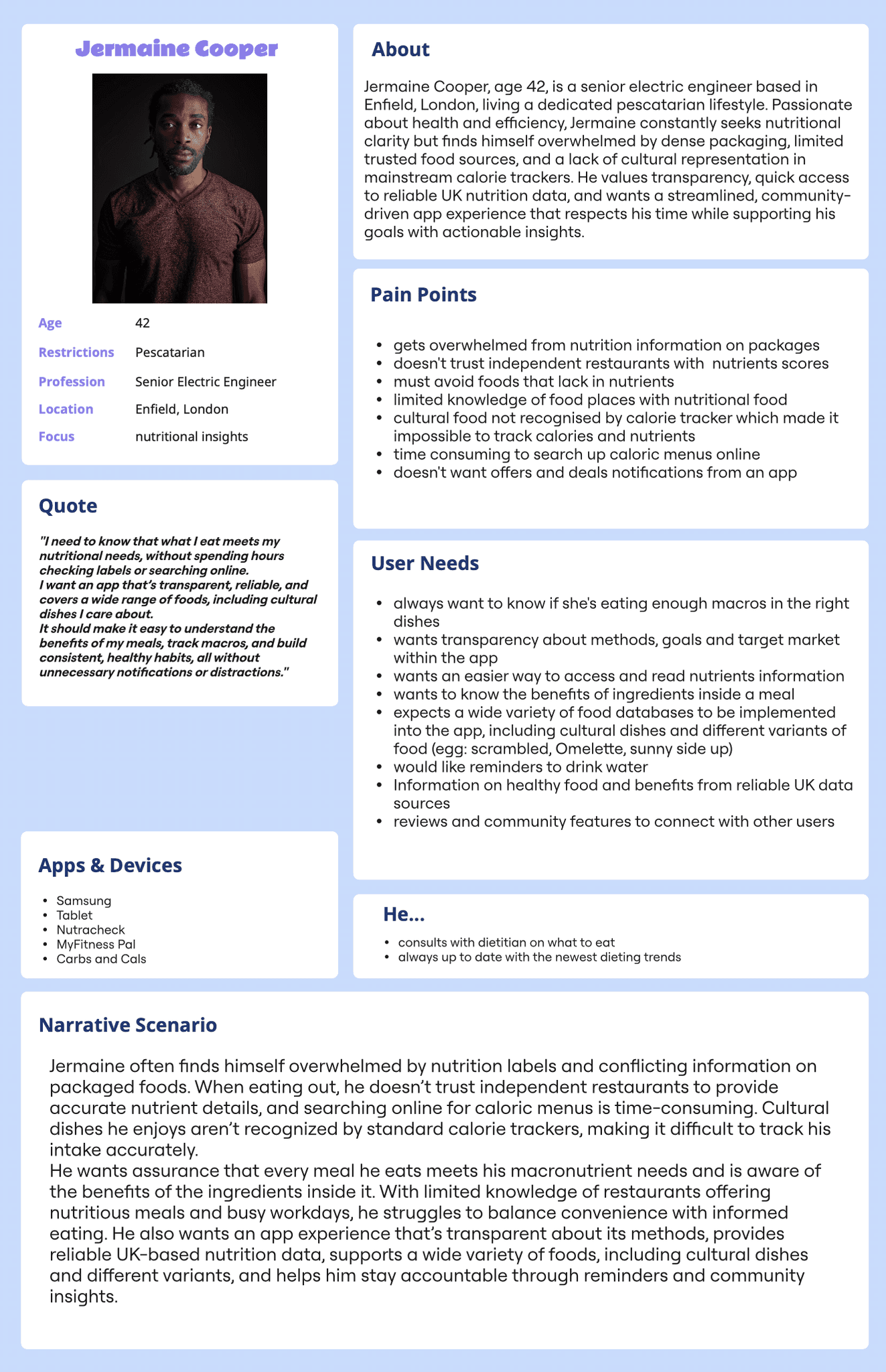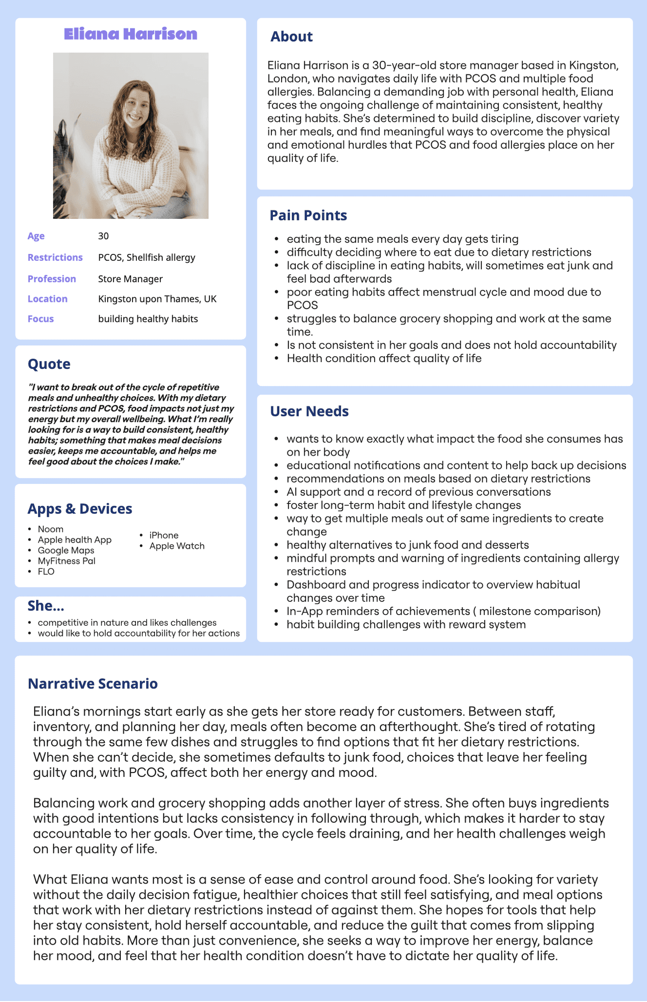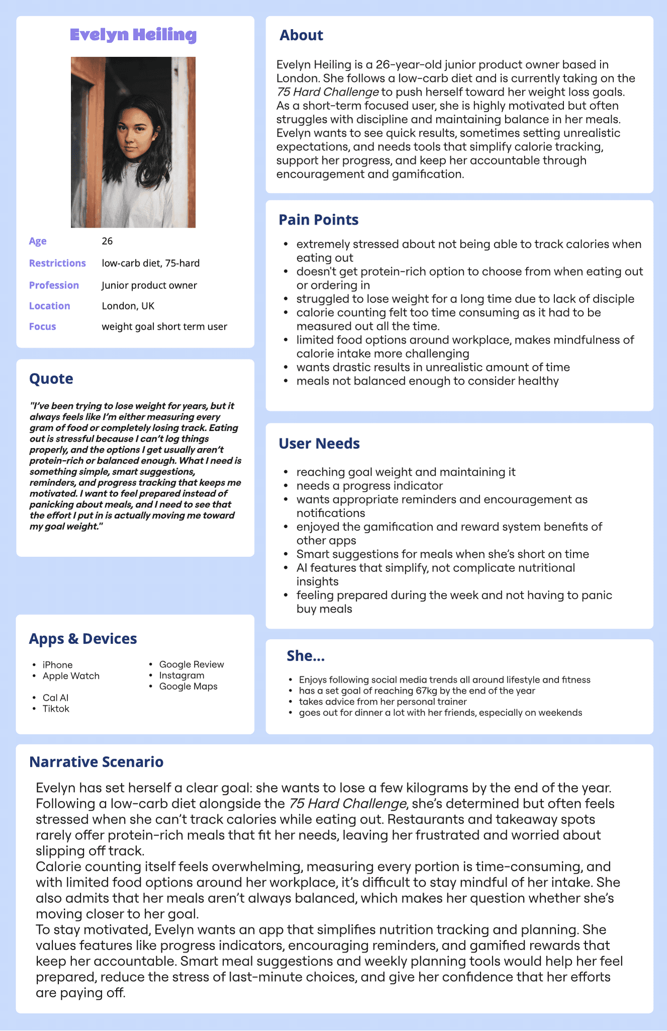 Proto-personas and User Journey Maps were developed after synthesising interview insights to represent key user types: busy, health-conscious professionals, helping align on user needs, empathise with their challenges, and prioritise features around convenience, accuracy, and trust.