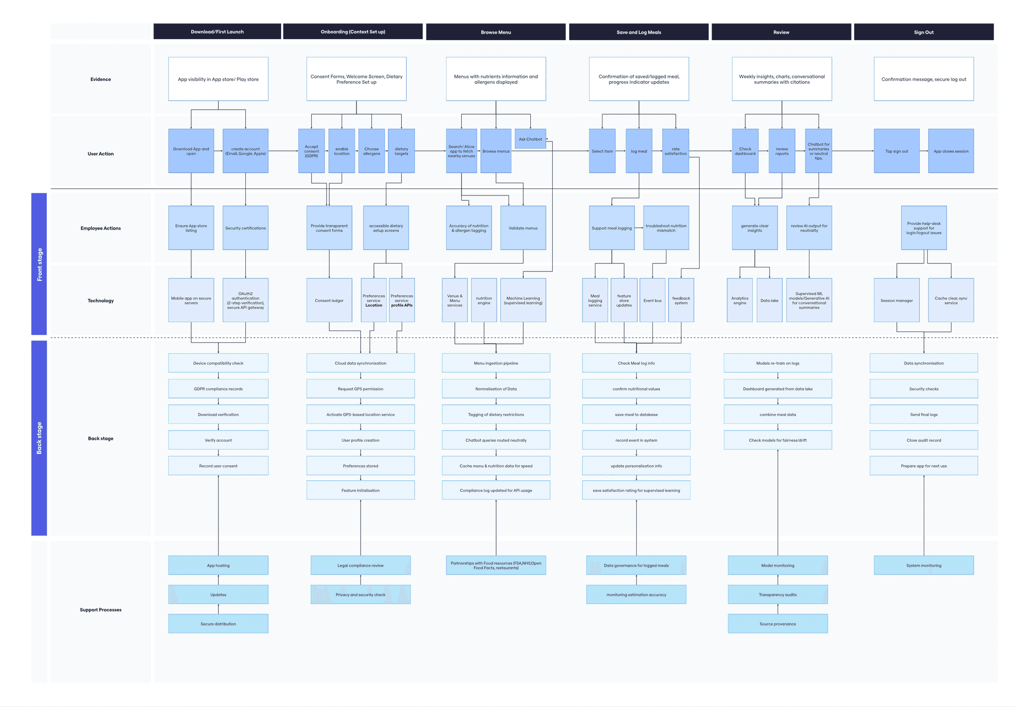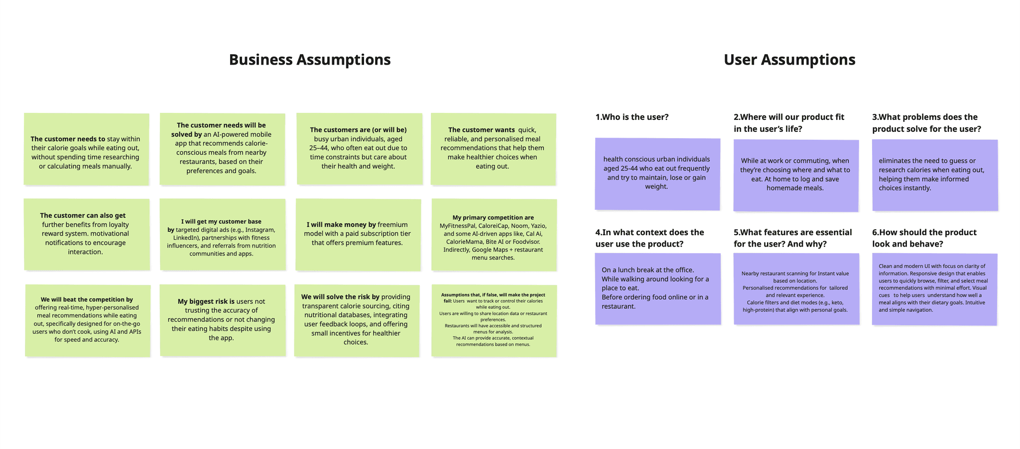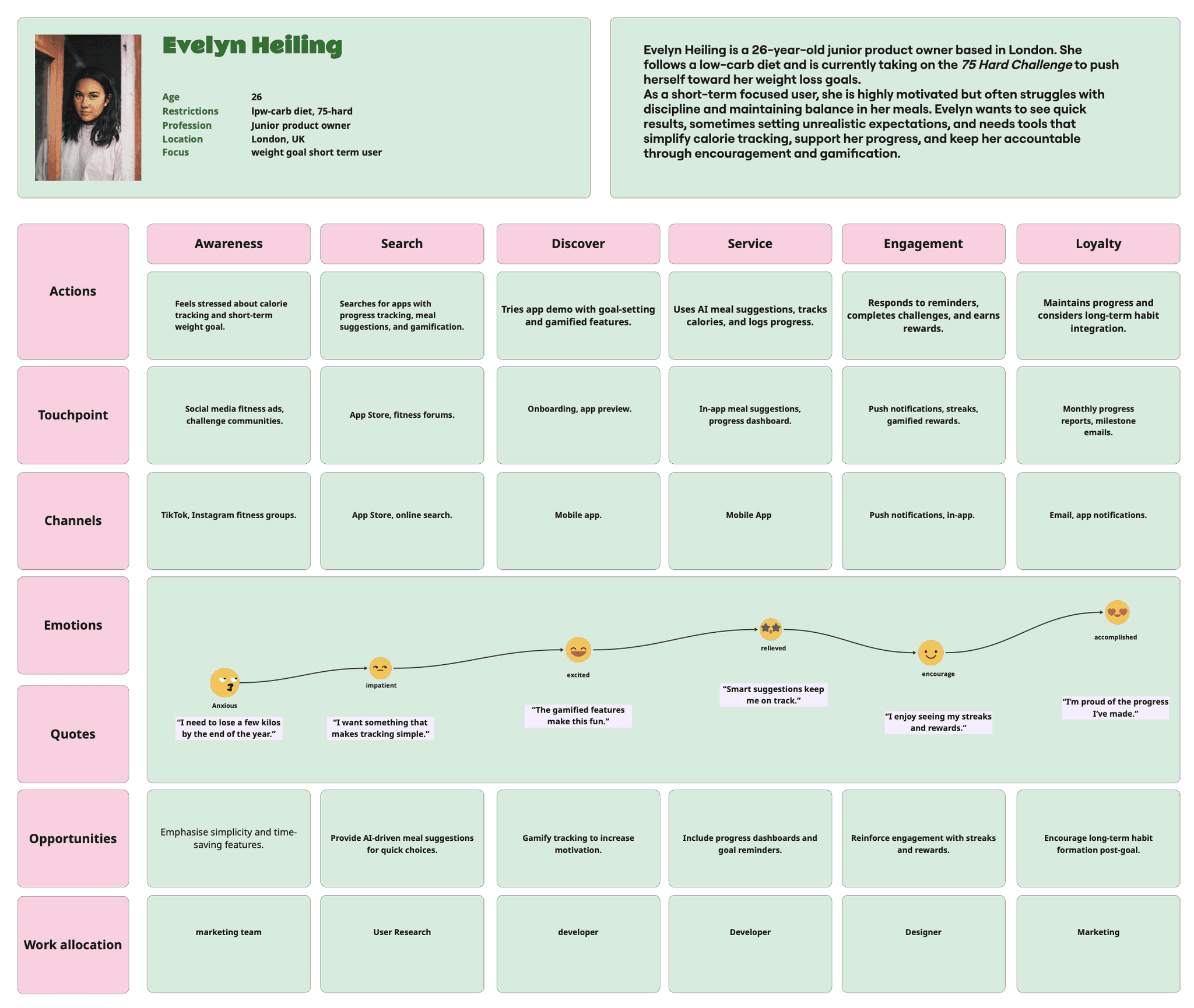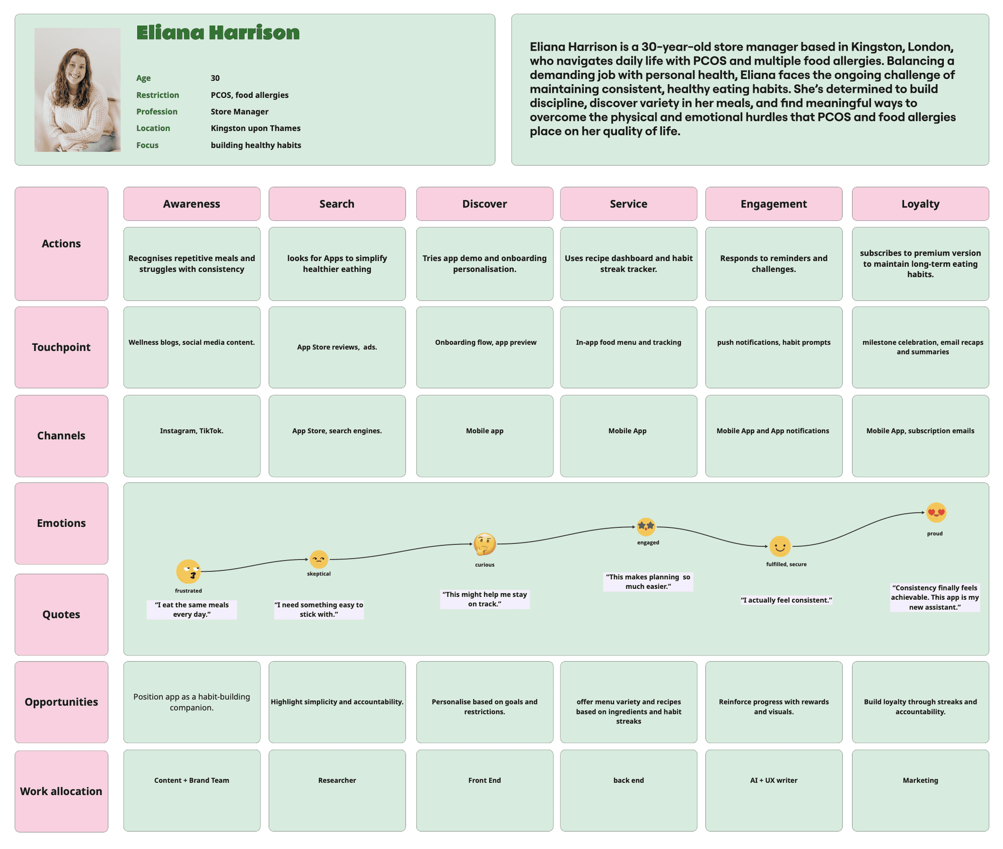 Proto-personas and User Journey Maps were developed after synthesising interview insights to represent key user types: busy, health-conscious professionals, helping align on user needs, empathise with their challenges, and prioritise features around convenience, accuracy, and trust.