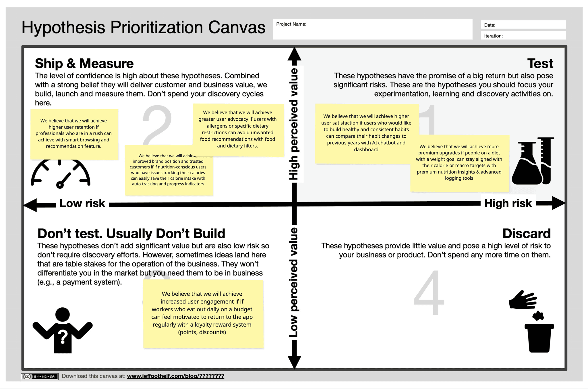 and an Eisenhower prioritisation chart to identify which hypotheses are most urgent and important to validate first.