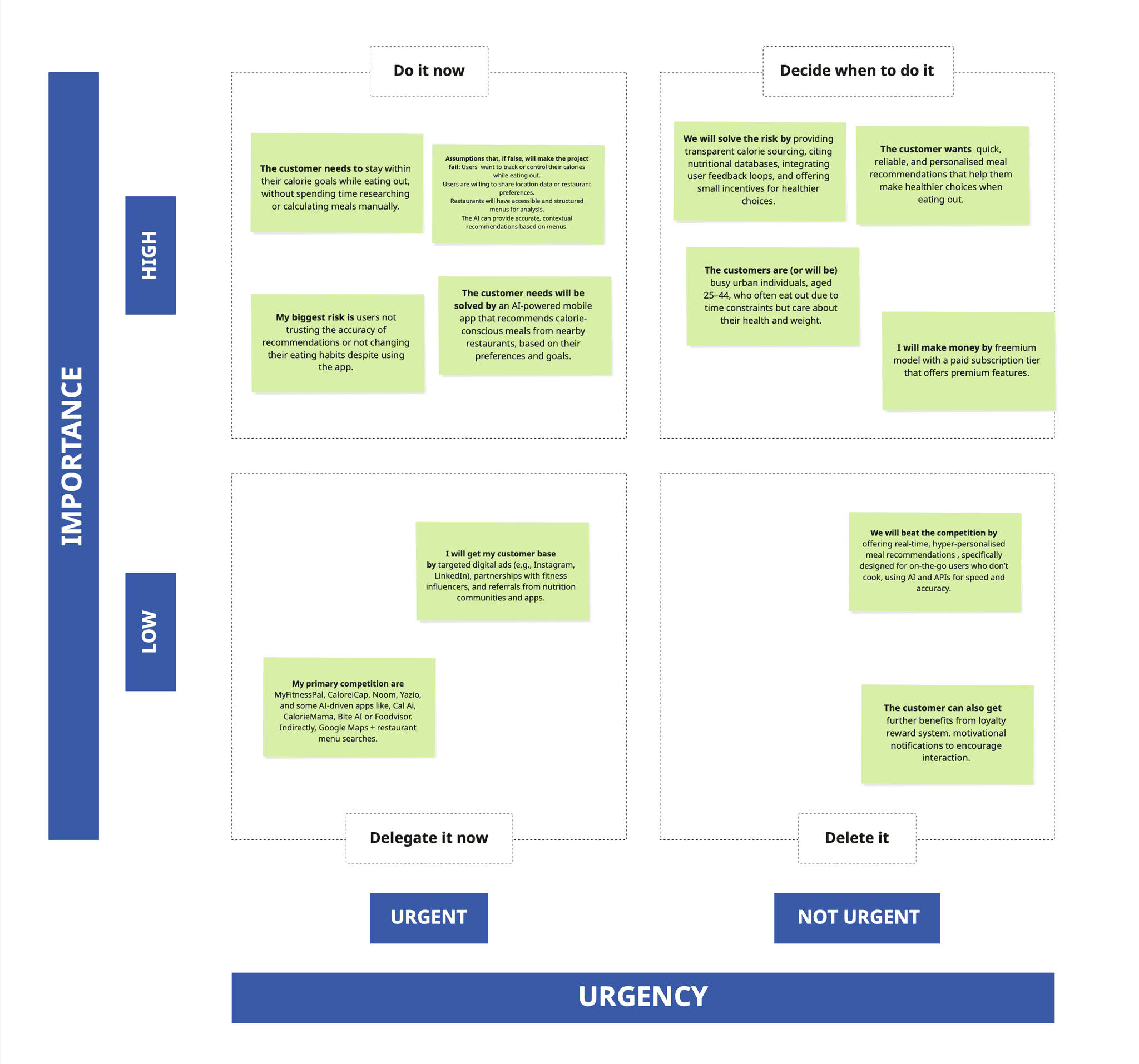 They were organised in an Eisenhower prioritisation chart to separate urgent from important assumptions, ensuring focus on what most impacts the project’s success.